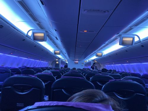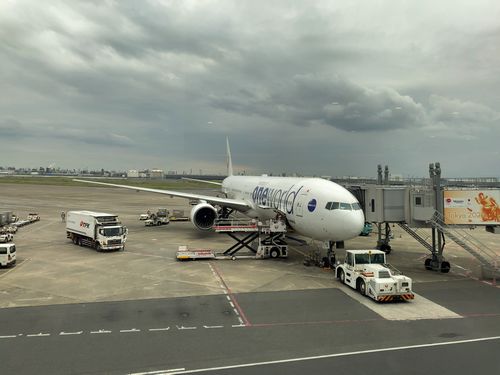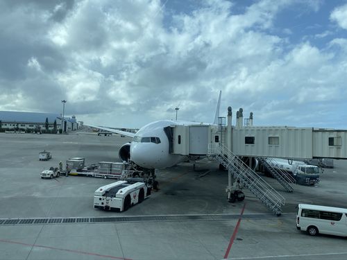 ようやく空港についてチェックイン機でチェックインし、荷物預け入れの列に並ぶと私達の使う便の利用者は別レーンで預け入れをさせてくれました。しかしこの時点で私達の乗る便はDELAY表示が出ていて慌てずに手荷物検査を受けることができました。搭乗ゲートに行くとちょうど遅れて到着した私達の乗る機材が着いたところのようでした。