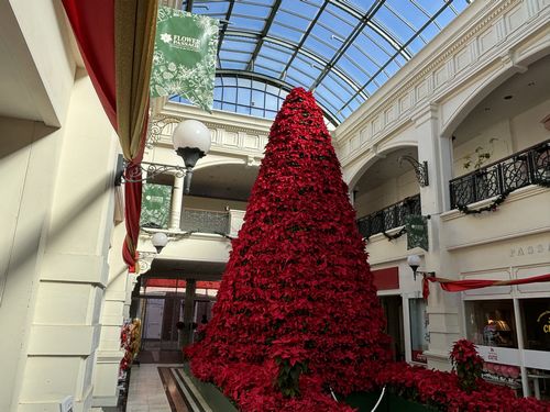 パサージュのポインセチアの鮮やかな赤いクリスマスツリーが見事でした。