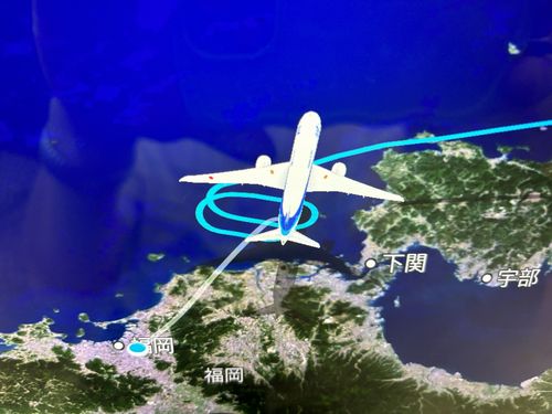 福岡空港までの空は揺れることもなく順調でしたが、着陸する福岡空港が混雑しているとのことで順番待ちで海の上を旋回してからちょっと遅れての着陸となりました。