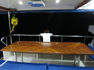 この日も朝早く目覚めていつもどおり5時に後方デッキに行くとクロちゃんがマンタが来ていないか見ていてくれました。