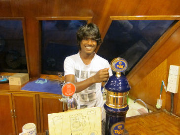 それでも、いつもどおり夕飯にはビールです。今日はボートクルーのこの男の子が注いでくれました。