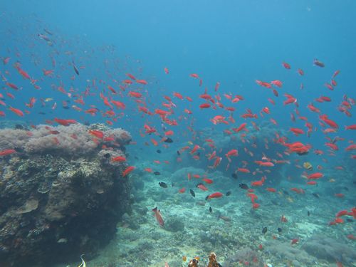 水面休憩を終えてSombreroに潜るとキンギョハナダイが群れています。