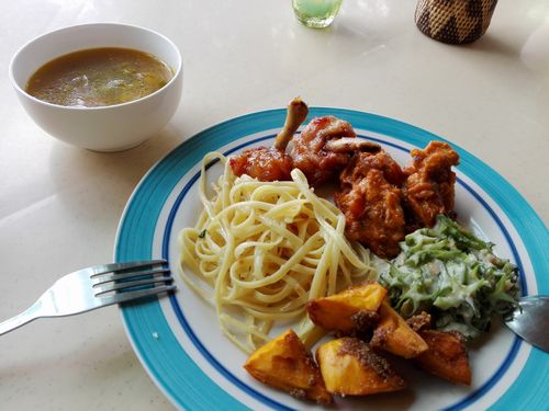 ここで午前のダイビングは終了です。ヴィラマグダレナに戻って昼食です。Garlic Pasta,Tulip Chili,Pork Caldereta,Ginataang SigarilyasにSweet Potatoです。ご飯もありましたが炭水化物を少しは抑えようと思って取りませんでした。